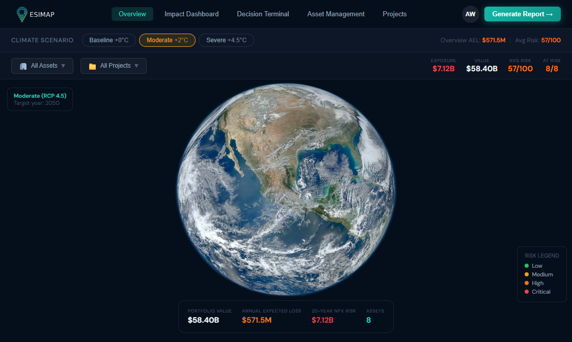 "One Platform, Three Terminals. Complete visibility and transparency from asset-level exposure to portfolio-level mitigation, ESIMAP is powered by real-time economic intelligence."